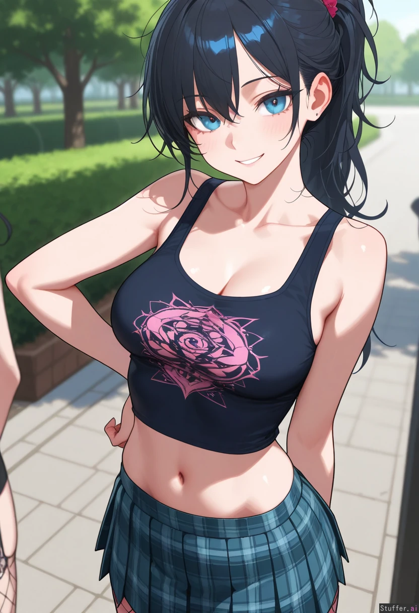 Gorgeous girl. Sexy, detailed face. 8k detail. Exceptional quality. Blue, gorgeous eyes. Long Messy black hair in a messy ponytail. Big, sexy smile. Wearing white, cropped tank top with rose design on front. Wearing green pleated, plaid_skirt. Wearing pink fishnet_pantyhose. Standing in park. skinny body.