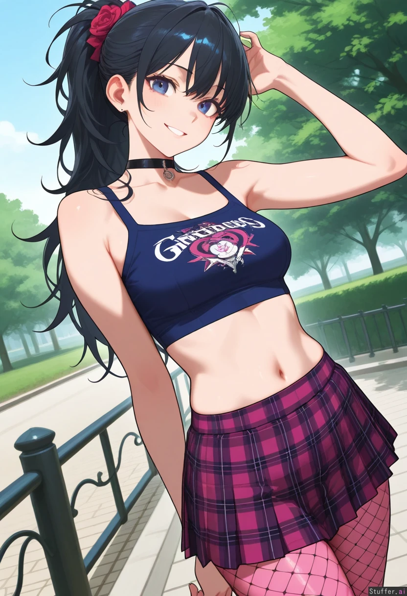 Gorgeous girl. Sexy, detailed face. 8k detail. Exceptional quality. Blue, gorgeous eyes. Long Messy black hair in a messy ponytail. Big, sexy smile. Wearing white, cropped tank top with rose design on front. Wearing green pleated, plaid_skirt. Wearing pink fishnet_pantyhose. Standing in park. Slim body.