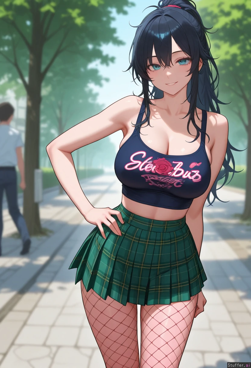 Gorgeous girl. Sexy, detailed face. 8k detail. Exceptional quality. Blue, gorgeous eyes. Long Messy black hair in a messy ponytail. Big, sexy smile. Wearing white, cropped tank top with rose design on front. Wearing green pleated, plaid_skirt. Wearing pink fishnet_pantyhose. Standing in park. Slim body.