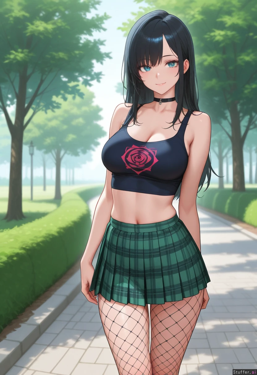 Gorgeous girl. Sexy, detailed face. 8k detail. Exceptional quality. Blue, gorgeous eyes. Long Messy black hair. Big, sexy smile. Wearing white, cropped tank top with rose design on front. Wearing green pleated, plaid_skirt. Wearing pink fishnet_pantyhose. Standing in park. Slim body.
