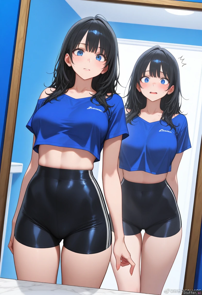 Gorgeous girl. Sexy, detailed face. 8k detail. Exceptional quality. Blue, gorgeous eyes. Long Messy black hair. Shocked facial expression. Wearing blue, loose fitting crop top. Wearing high waisted black spandex shorts. Slim body. Standing in front of mirror. side_view.