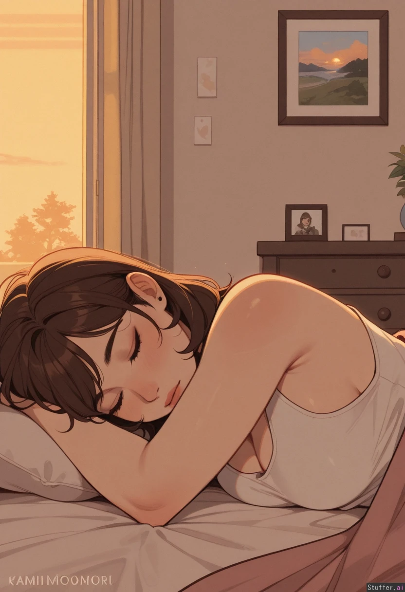 Highly detailed, morning, warm colors, KAMII MOMORU (artist), sleeping, bedroom, windows Japanese girl, medium hair, brown hair, tank top, breast_out