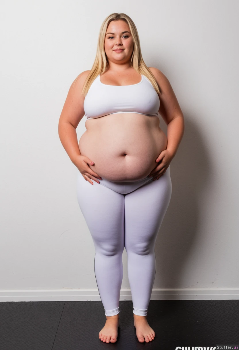 An attractive blonde with long straight hair she wears low-waisted white track bottoms and gym top ((correct number of feet)), standing proudly perfect skin, hands cradling her chubby belly, no dimples, no cellulite (chubby:1.6), (plump: 1.3), (wide hips: 1.8), (fatter pudgier wider fuller hip dips: 1.6) (wider fatter midriff: 1.4) (belly spilling over her leggings: 1.6) Muffintop spilling over her leggings: 1.8) (fatter fuller pudgier wider thighs: 1.3) (heavy hips and thighs: 1.1)