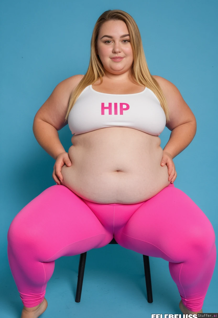 An attractive blonde, proud, sitting long straight hair she wears low-waisted white jogging bottoms and gym top ((correct number of feet)), perfect skin, hands cradling her chubby belly, no dimples, no cellulite (chubby:1.6), (plump: 1.3), (wide hips: 1.8), (fatter pudgier wider fuller hip dips: 1.6) (wider fatter midriff: 1.4) (belly spilling over her leggings: 1.6) Muffintop spilling over her leggings: 1.8) (fatter fuller pudgier wider thighs: 1.3) (heavy hips and thighs: 1.1)