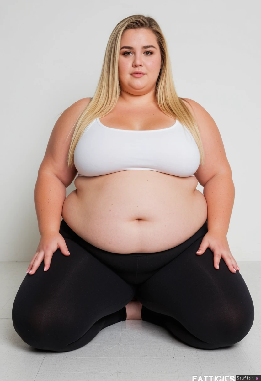 An attractive blonde, proud, sitting long straight hair she wears low-waisted white jogging bottoms and gym top ((correct number of feet)), perfect skin, hands cradling her chubby belly, no dimples, no cellulite (chubby:1.6), (plump: 1.3), (wide hips: 1.8), (fatter pudgier wider fuller hip dips: 1.6) (wider fatter midriff: 1.4) (belly spilling over her leggings: 1.6) Muffintop spilling over her leggings: 1.8) (fatter fuller pudgier wider thighs: 1.3) (heavy hips and thighs: 1.1)
