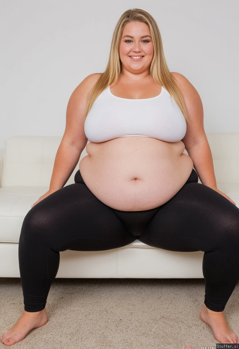 An attractive blonde, happy, proud, sitting long straight hair she wears low-waisted white jogging bottoms and gym top ((correct number of feet)), perfect skin, hands cradling her chubby belly, no dimples, no cellulite (chubby:1.6), (plump: 1.3), (wide hips: 1.8), (fatter pudgier wider fuller hip dips: 1.6) (wider fatter midriff: 1.4) (belly spilling over her leggings: 1.6) Muffintop spilling over her leggings: 1.8) (fatter fuller pudgier wider thighs: 1.3) (heavy hips and thighs: 1.1)