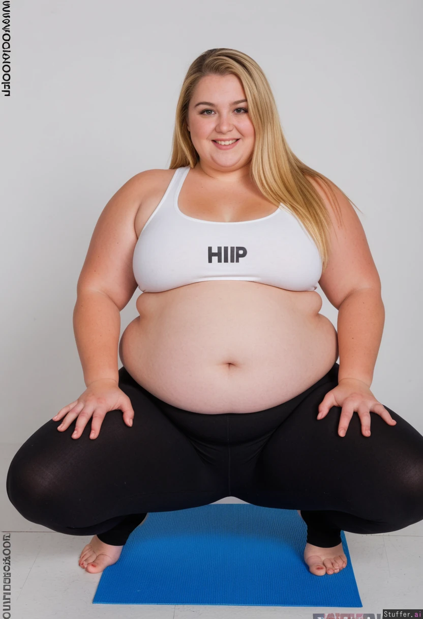 An attractive blonde, happy, proud, sitting long straight hair she wears low-waisted white jogging bottoms and gym top ((correct number of feet)), perfect skin, hands cradling her chubby belly, no dimples, no cellulite (chubby:1.6), (plump: 1.3), (wide hips: 1.8), (fatter pudgier wider fuller hip dips: 1.6) (wider fatter midriff: 1.4) (belly spilling over her leggings: 1.6) Muffintop spilling over her leggings: 1.8) (fatter fuller pudgier wider thighs: 1.3) (heavy hips and thighs: 1.1)