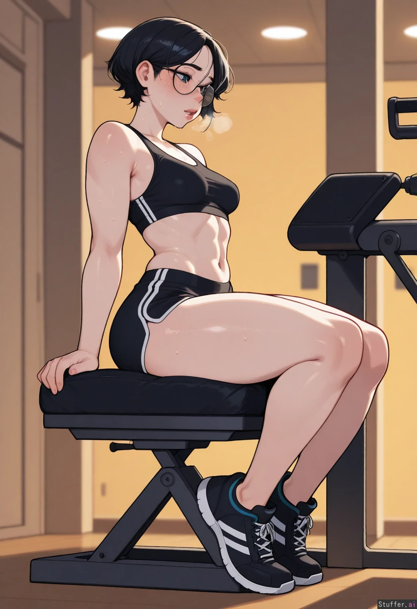 (highly detailed, best quality), (perfect anatomy, perfect proportions), (perfect lighting, warm lighting, vibrant colors, shadow, perfect shading), (beautiful face, beautiful eyes), (Krekkov (artist), KAMII MOMORU (artist), blushspicy, betterwithsalt) one girl, solo gym, golden hour lighting ((Asian girl), (black hair, short hair), (blue eyes, thin eyes), (pale skin, shiny skin, freckles), (adult, tall woman), (full lips), (black gym shorts, black sports bra, glasses) blushing, aroused, heavy breathing, panting, sweating, shy, exhausted, desperately hungry, stomach growlng (slender, muscular body, athletic body, abs), (small breasts, perky breasts), (narrow waist), (narrow hips), (muscular arms, muscular legs) full body, side view, sitting on weight machine