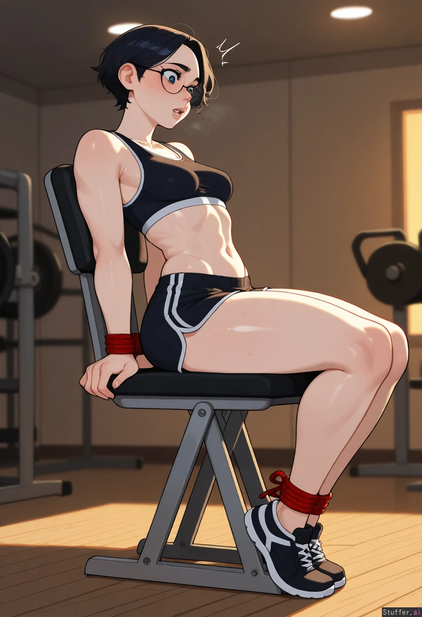 (highly detailed, best quality), (perfect anatomy, perfect proportions), (perfect lighting, warm lighting, vibrant colors, shadow, perfect shading), (beautiful face, beautiful eyes), (Krekkov (artist), KAMII MOMORU (artist), blushspicy, betterwithsalt) one girl, solo gym, golden hour lighting ((Asian girl), (black hair, short hair), (blue eyes, thin eyes), (pale skin, shiny skin, freckles), (adult, tall woman), (full lips), (black gym shorts, black sports bra, glasses) blushing, aroused, shocked, panting, sweating, shy, exhausted, desperately hungry, stomach growlng (slender, muscular body, athletic body, abs), (small breasts, perky breasts), (narrow waist), (narrow hips), (muscular arms, muscular legs) full body, side view, sitting on weight machine, arms tied to chair, legs tied to chair