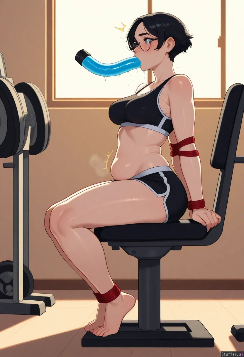 (highly detailed, best quality), (perfect anatomy, perfect proportions), (perfect lighting, warm lighting, vibrant colors, shadow, perfect shading), (beautiful face, beautiful eyes), (Krekkov (artist), KAMII MOMORU (artist), blushspicy, betterwithsalt) one girl, solo gym, golden hour lighting ((Asian girl), (black hair, short hair), (blue eyes, thin eyes), (pale skin, shiny skin, freckles), (adult, tall woman), (full lips), (black gym shorts, black sports bra, glasses) blushing, aroused, shocked, panting, sweating, shy, exhausted, desperately hungry, stomach growlng (slender, muscular body, athletic body, small belly), (medium breasts, perky breasts), (slim waist), (narrow hips), (slim arms, pudgy legs) full body, side view, sitting on weight machine, arms tied to chair, legs tied to chair, (((thick black tube in mouth))), force feeding, chewing, weight gain