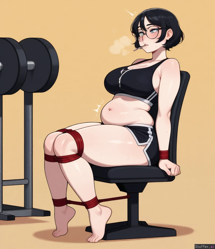 (highly detailed, best quality), (perfect anatomy, perfect proportions), (perfect lighting, warm lighting, vibrant colors, shadow, perfect shading), (beautiful face, beautiful eyes), (Krekkov (artist), KAMII MOMORU (artist), blushspicy, betterwithsalt) one girl, solo gym, golden hour lighting ((Asian girl), (black hair, short hair), (blue eyes, thin eyes), (pale skin, shiny skin, freckles), (adult, tall woman), full lips, (black gym shorts, black sports bra, glasses) blushing, aroused, shocked, panting, sweating, shy, exhausted, desperately hungry, stomach growlng (Thick thighs: 1.1, athletic body, fat belly: 1.2), (fat breasts: 1.3), (slim waist), (wide hips: 0.6), (slim arms, pudgy legs) full body, (facing right), side view, sitting on weight machine, arms tied to chair, legs tied to chair, (((thick black tube in mouth))), force feeding, chewing, weight gain, cream on chest, cream dripping
