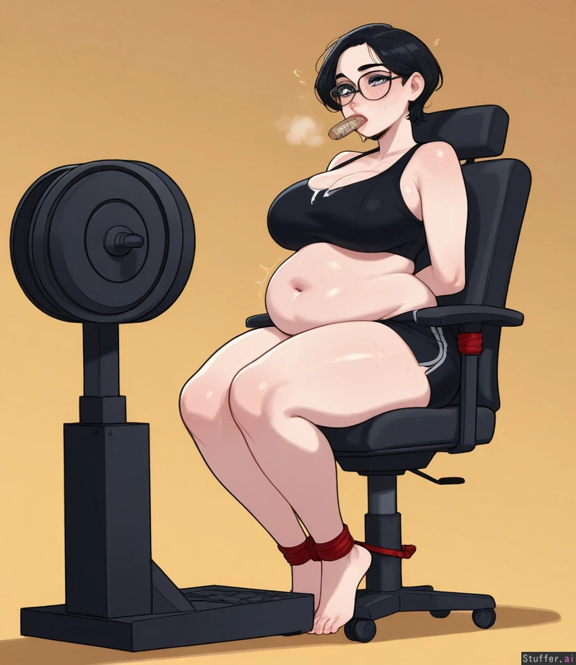 (highly detailed, best quality), (perfect anatomy, perfect proportions), (perfect lighting, warm lighting, vibrant colors, shadow, perfect shading), (beautiful face, beautiful eyes), (Krekkov (artist), KAMII MOMORU (artist), blushspicy, betterwithsalt) one girl, solo gym, golden hour lighting ((Asian girl), (black hair, short hair), (blue eyes, thin eyes), (pale skin, shiny skin, freckles), (adult, tall woman), full lips, (black gym shorts, black sports bra, glasses) blushing, aroused, calm, sweating, shy, exhausted, desperately hungry, (Thick thighs: 1.1, athletic body, huge belly: 1.4), (fat breasts: 1.3), (slim waist), (wide hips: 0.8), (slim arms, pudgy legs) full body, (facing right), side view, sitting on weight machine, arms tied to chair, legs tied to chair, (((thick black tube in mouth))), force feeding, chewing, cream on chest, cream dripping