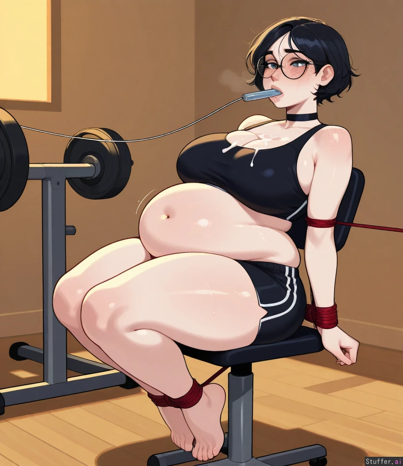 (highly detailed, best quality), (perfect anatomy, perfect proportions), (perfect lighting, warm lighting, vibrant colors, shadow, perfect shading), (beautiful face, beautiful eyes), (Krekkov (artist), KAMII MOMORU (artist), blushspicy, betterwithsalt) one girl, solo gym, golden hour lighting ((Asian girl), (black hair, short hair), (blue eyes, thin eyes), (pale skin, shiny skin, freckles), (adult, tall woman), full lips, (black gym shorts, black sports bra, glasses) blushing, aroused, calm, sweating, shy, exhausted, desperately hungry, (Thick thighs: 1.1, athletic body, huge belly: 1.9), (fat breasts: 1.3), (wide hips: 0.8), (slim arms, pudgy legs), (gigantic belly: 1.2) full body, (facing right), side view, (sitting on weight machine), arms tied to chair, legs tied to chair, (((thick black tube in mouth))), force feeding, chewing, cream on chest, feeding tube