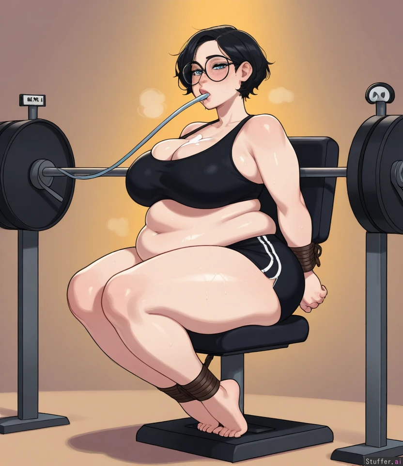 (highly detailed, best quality), (perfect anatomy, perfect proportions), (perfect lighting, warm lighting, vibrant colors, shadow, perfect shading), (beautiful face, beautiful eyes), (Krekkov (artist), KAMII MOMORU (artist), blushspicy, betterwithsalt) one girl, solo gym, golden hour lighting ((Asian girl), (black hair, short hair), (blue eyes, thin eyes), (pale skin, shiny skin, freckles), (adult, tall woman), full lips, (black gym shorts, black sports bra, glasses) blushing, aroused, calm, sweating, shy, exhausted, desperately hungry, (Thick thighs: 1.1, chubby face, huge belly: 1.9), (fat breasts: 1.3), (wide hips: 0.8), (slim arms, pudgy legs), (gigantic belly: 1.2) full body, (facing right), side view, (sitting on weight machine), arms tied to chair, legs tied to chair, (((thick black tube in mouth))), force feeding, chewing, cream on chest, feeding tube