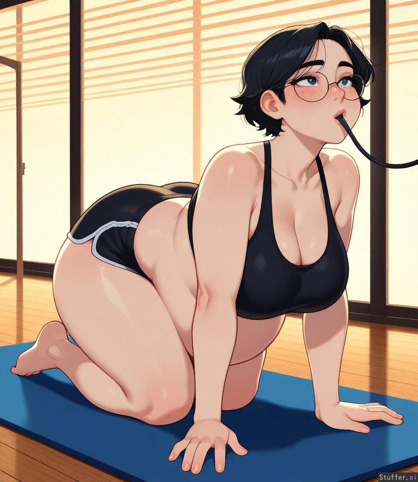 (highly detailed, best quality), (perfect anatomy, perfect proportions), (perfect lighting, warm lighting, vibrant colors, shadow, perfect shading), (beautiful face, beautiful eyes), (Krekkov (artist), KAMII MOMORU (artist), blushspicy, betterwithsalt) one girl, solo gym, golden hour lighting ((Asian girl), (black hair, short hair), (blue eyes, thin eyes), (pale skin, shiny skin, freckles), (adult, tall woman), full lips, (black gym shorts, black sports bra, glasses) blushing, aroused, calm, sweating, shy, exhausted, desperately hungry, looking up (Thick thighs: 1.1, chubby face, huge belly: 1.9), (fat breasts: 1.3), (wide hips: 0.8), (slim arms, pudgy legs), (gigantic belly: 1.6) full body, (facing right, on knees), side view, (yoga mat), all_fours, (((thick black tube in mouth))), chewing, feeding tube
