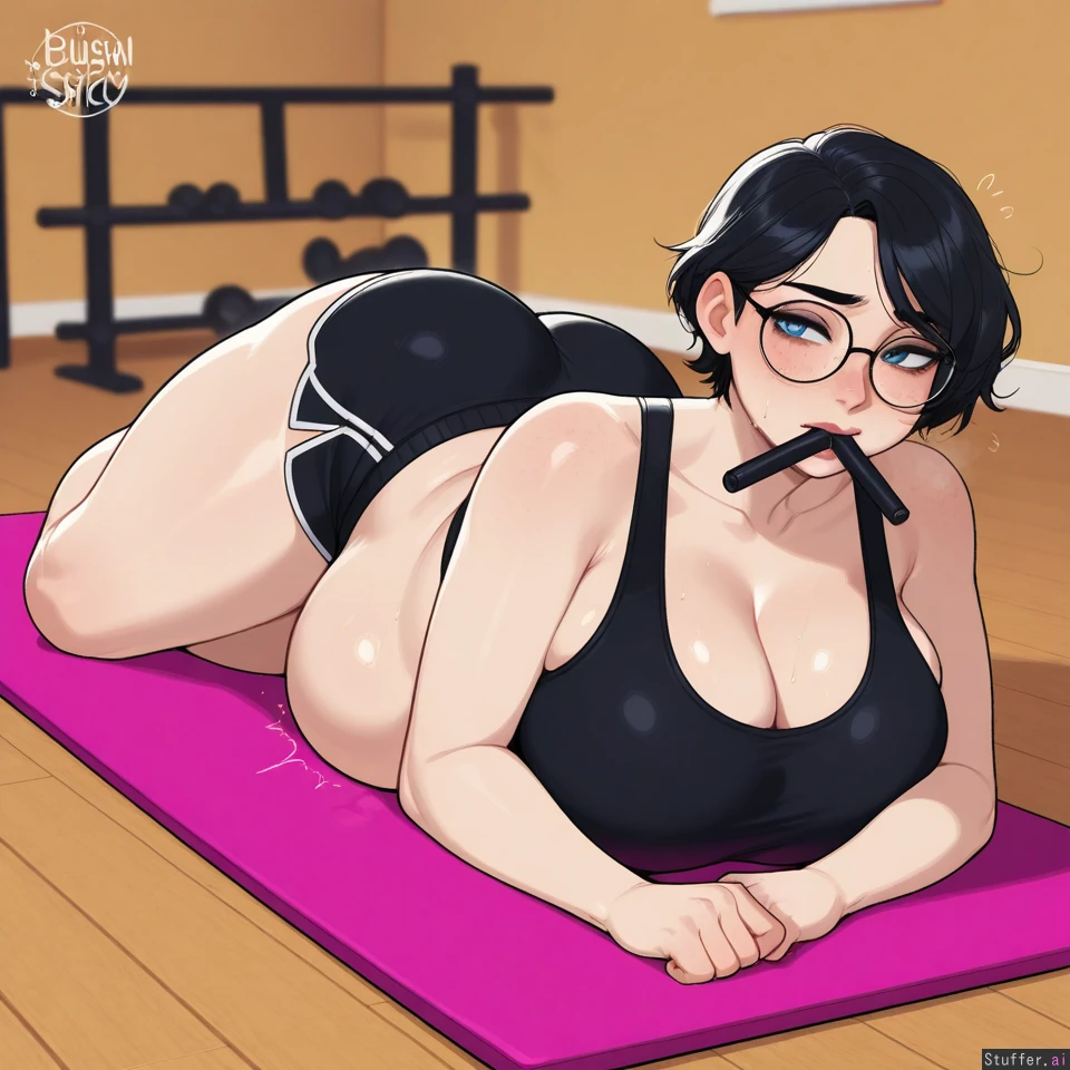 (highly detailed, best quality), (perfect anatomy, perfect proportions), (perfect lighting, warm lighting, vibrant colors, shadow, perfect shading), (beautiful face, beautiful eyes), (Krekkov (artist), KAMII MOMORU (artist), blushspicy, betterwithsalt) one girl, solo gym, weight equipment in background, golden hour lighting ((Asian girl), (black hair, short hair), (blue eyes, thin eyes), (pale skin, shiny skin, freckles), (adult, tall woman), full lips, (black torn gym shorts, black sports bra, glasses) blushing, aroused, sweating, shy, exhausted, desperately hungry, (breasts: 1.3), (wide hips: 0.8), (gigantic belly: 1.5), belly touching ground, on belly full body, side_view (yoga mat), (((huge black tube in mouth))), (belly_on_ground),