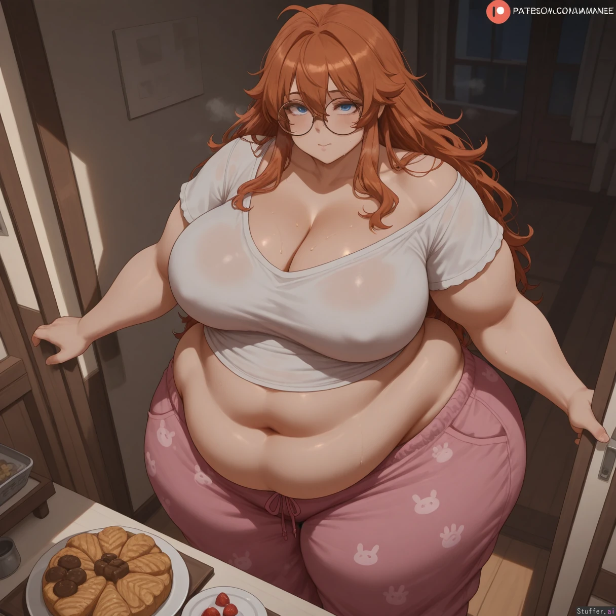 best quality), (high rating), absurd res, high res, detailed, ultra quality, (high quality), masterpiece, stunning beauty, (((detailed face:1.3))), intricate detail, beautiful face, exquisite detail, absurd resolution, correct anatomy, 8k, high definition picture, (highly detailed face), highly detailed skin texture, detailed background, ((perfect human anatomy)), better-with-salt(artist), c.cu(artist), shexyo(artist), mdf_an(artist), araneesama(artist), cutesexyrobutts(artist), w-oo-t(artist),(artist), butty-butter(artist) **Character:** 1girl. **Body Appearance:** (large breasts:1.0), freckles, ((chubby belly:1.6)), ((wide hips:1.7)), ((round chubby face:1.6)), bottomheavy, fat rolls, love handles, (((obese:1.3))), ((obese legs:1.6)), ((bulky limbs)), ((muffin_top)), ((thick thighs:1.4)), ((((fat arms:1.4)))), ((fat boobs:1.2)), cleavage, **Eye:** Blue eyes. **Emotions:** blush, (ahegao), sweaty, looking at viewer, **Hair/styles:** Long hair, messy hair, (ginger hair), **Clothes:** pajamas, round glasses, ((pajama pants:2)), off shoulder shirt, ((belly partially covered)), **Setting:** kitchen, cake, macroons, box of donuts, pastries, (night), **Actions:** standing, heavy breathing, sexual pose, **Perspective::** ((From above)), close to viewer,
