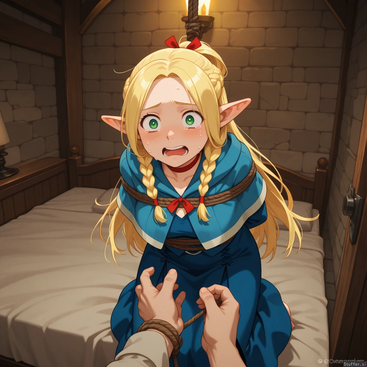 afraid, scared, crying, tearful, Marcille_Donato_(delicious_in_dungeon), entering bedchambers, hands tied behind back with rope,