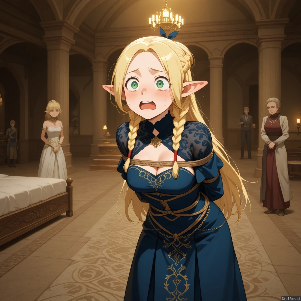 shocked, anxious, scared, crying, tearful, Marcille_Donato_(delicious_in_dungeon), entering bedchambers, hands tied behind back with rope, opulent luxurious bedchambers of massive royal marble Arabian palace in desert land, marble Arabian palace theme, amazing quality, high resolution,