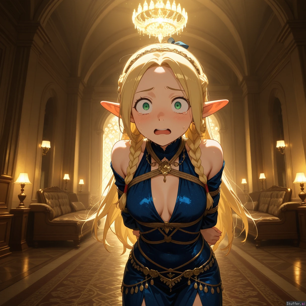 shocked, anxious, scared, crying, tearful, Marcille_Donato_(delicious_in_dungeon), hands tied behind back with rope, opulent luxurious bedroom, (marble Arabian palace, marble Arabian palace theme, bright lighting), amazing quality, high resolution,