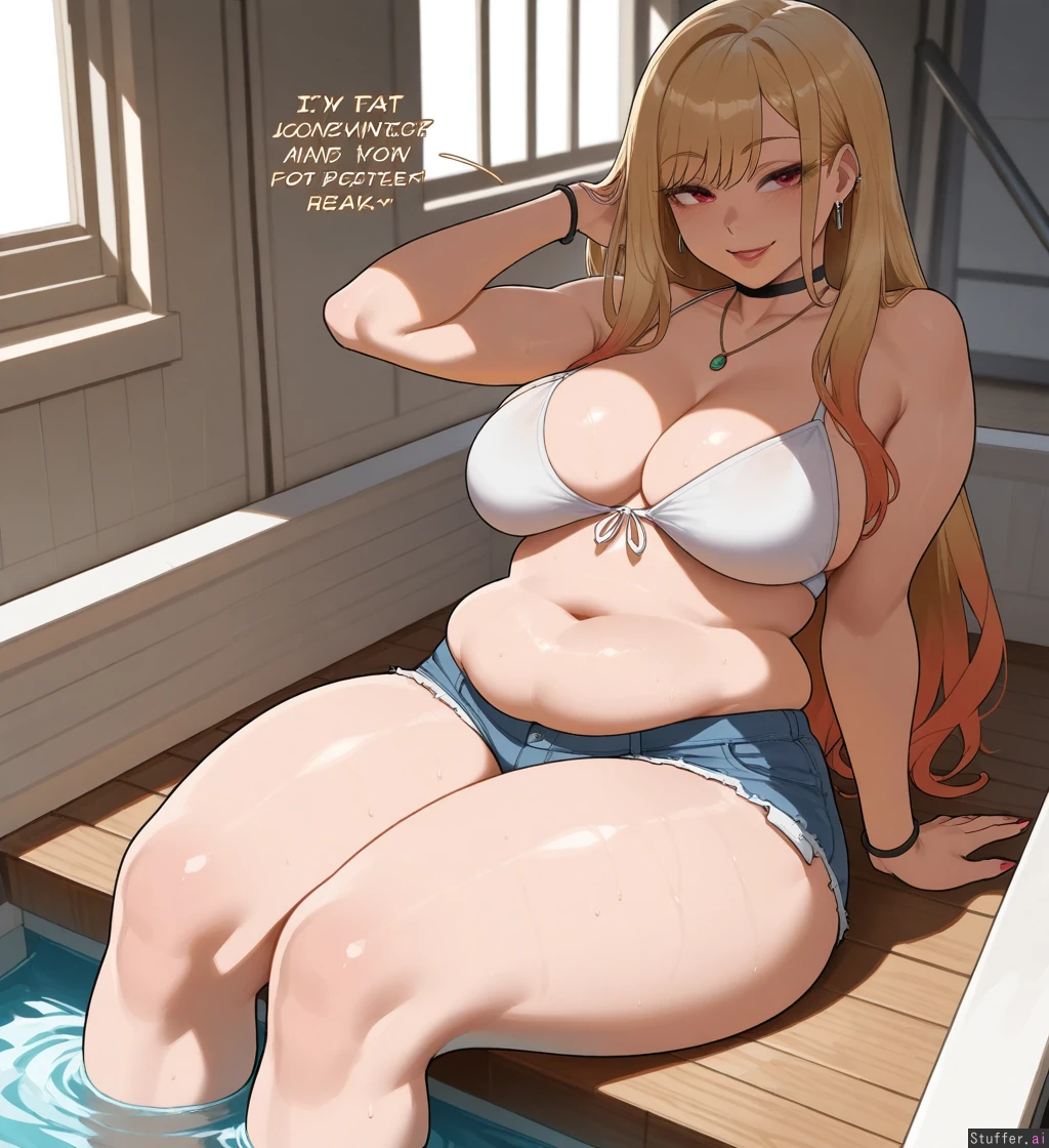 ((Solo, 1 woman)), ((nyantcha)))), (krekkov), c.cu(artist), araneesama(artist), 8k, high resolution, gorgeous, masterpiece, ((flawless)), (((high rating))), ((highly detailed face)), beautiful face, ((((fat female)))), ((((thick milf)))), (((steamy))), (((skindentation))), ((())), ((())), ((((solo_female)))), (()), ((((Marin Kitagawa)))), ((())), (()), (((White top, shorts))), (()), (((Fat: 1.4))), ((medium breasts:0.5)), hips and thighs much wider than upper body,bottomheavy,((voluptuous)), ((massive wide hips:1.4)), ((huge fast thighs: 1.4)),sweaty, (((Sexy, seductive))), ((((())))), on boat, looking at viewer, sitting