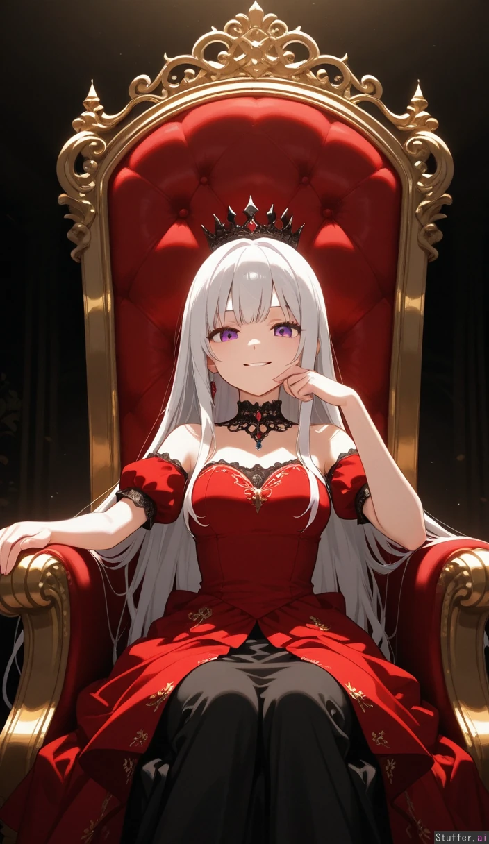 White hair, straight hair, long hair, purple eyes, Red white and black royal dress, Sitting on throne, hand on cheek, smirking,