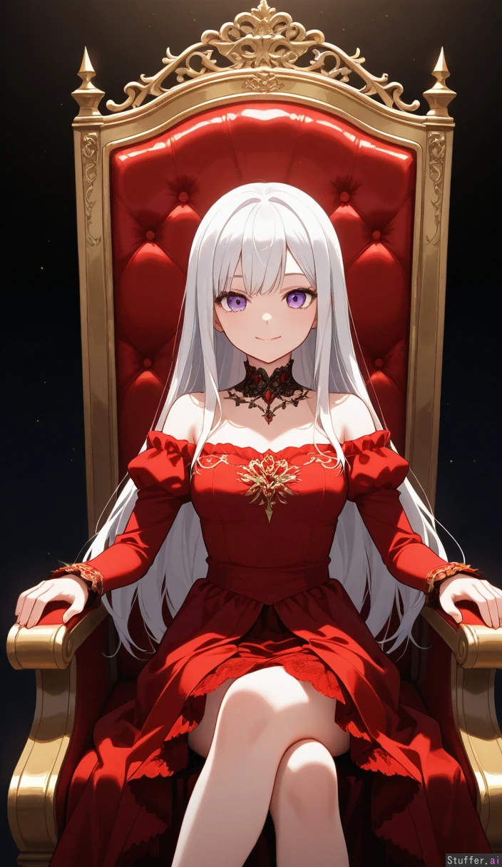 White hair, straight hair, long hair, purple eyes, Red white and black royal dress, Sitting on throne, happy,
