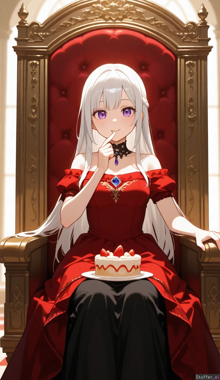 White hair, straight hair, long hair, purple eyes, Red white and black royal dress, Sitting on throne, happy, eating cake, (((Weight:1.0)))