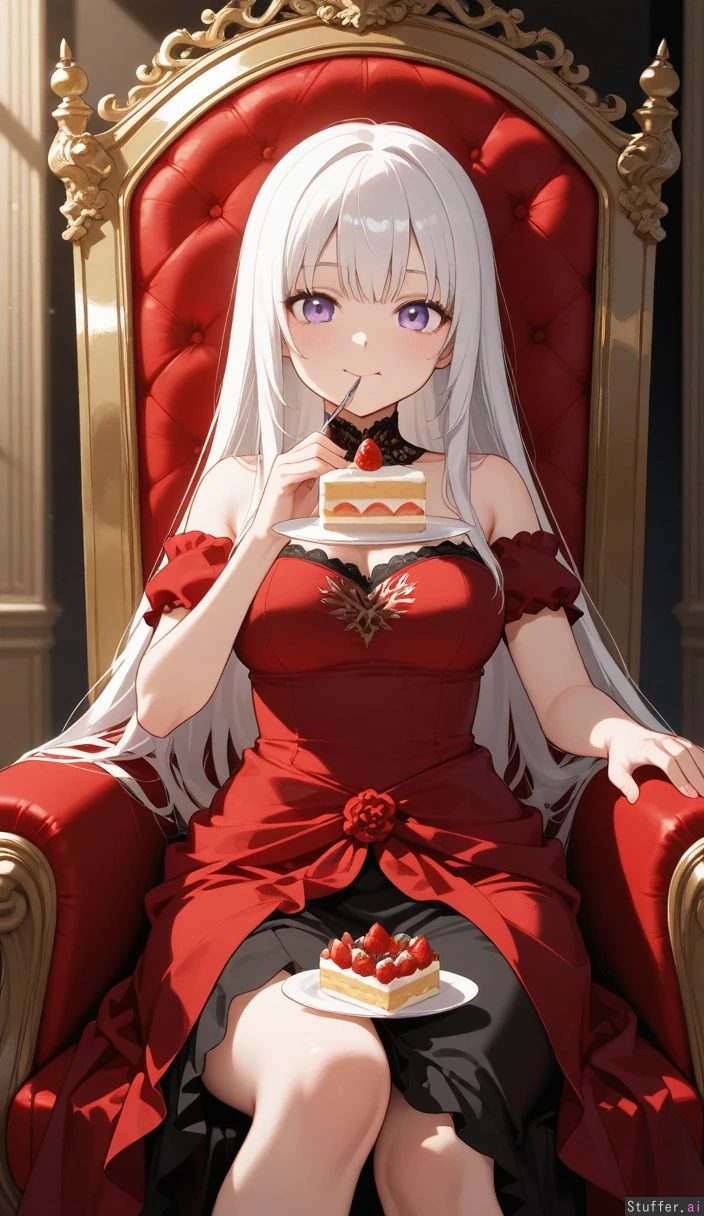 White hair, straight hair, long hair, purple eyes, Red white and black royal dress, Sitting on throne, happy, eating cake, (((Weight:1.4)))