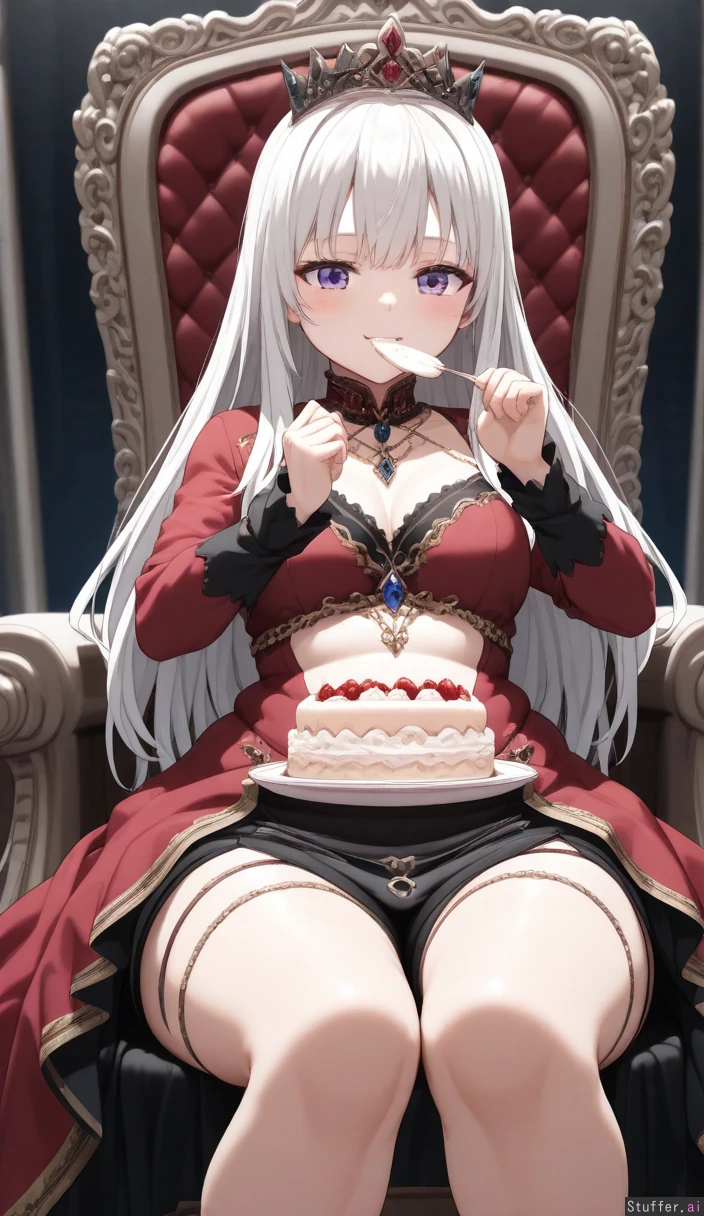 White hair, straight hair, long hair, purple eyes, Red white and black royal dress, Sitting on throne, happy, eating cake, (((Weight:2.4)))
