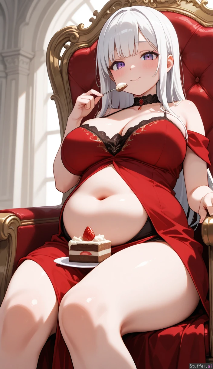 Sitting on throne, happy, eating cake, blushing,