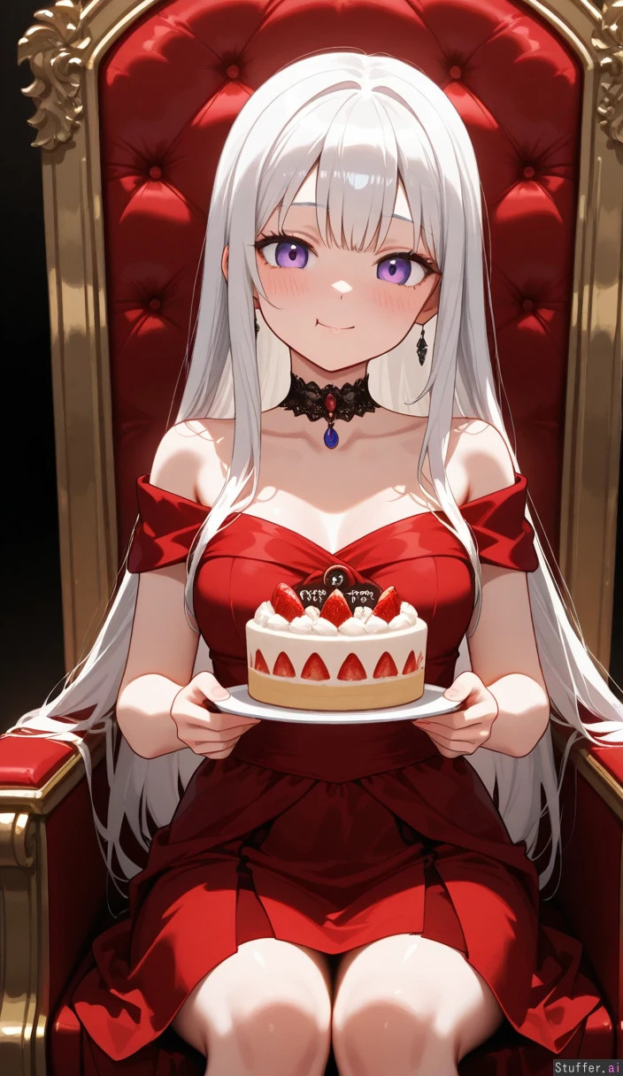 White hair, straight hair, long hair, purple eyes, Red white and black royal dress, choker, Sitting on throne, happy, eating cake, blushing, (((Thighs:0.2))), (((breasts:0.2))), (((hips:0.2))), (((belly:0.2))), (((chubby arms:0.2))) Viewed from front,