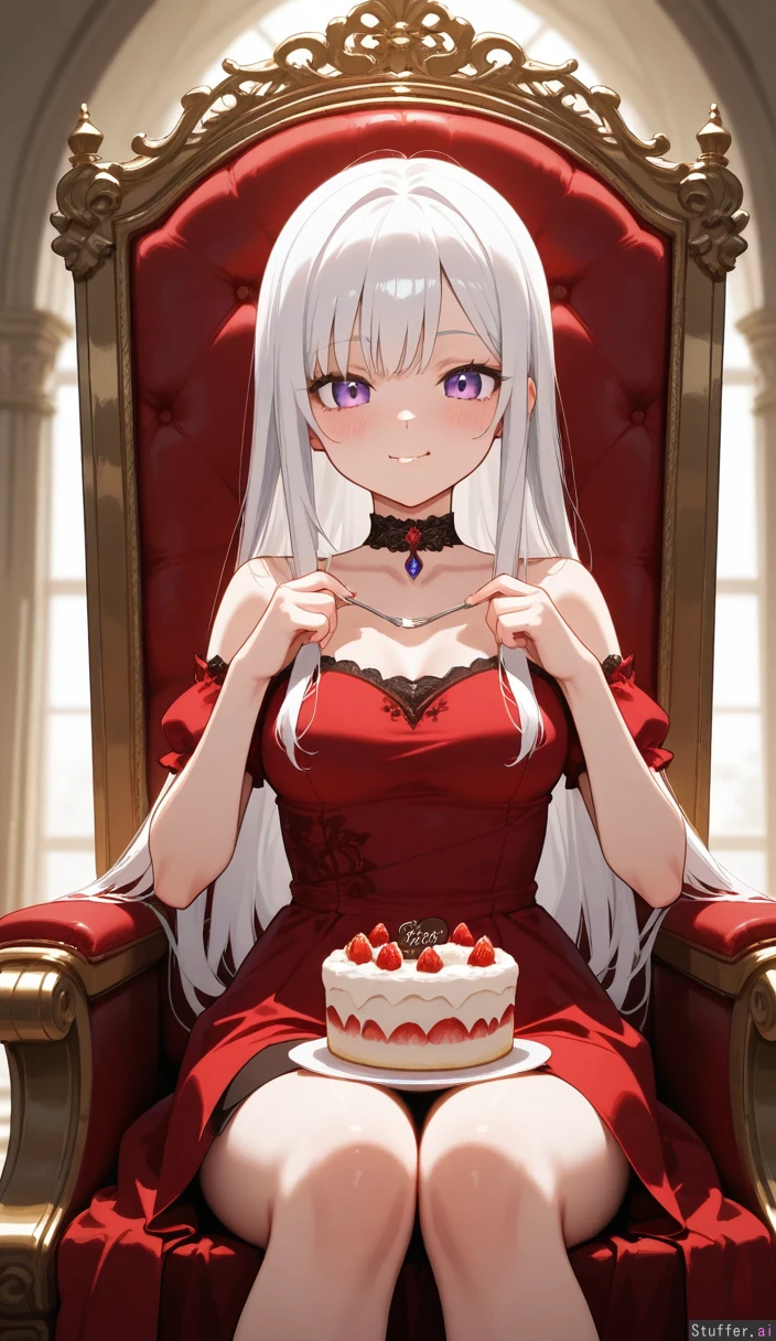 White hair, straight hair, long hair, purple eyes, eye liner, Red white and black royal dress, choker, Sitting on throne, happy, eating cake, blushing, (((Thighs:0.2))), (((breasts:0.2))), (((hips:0.2))), (((belly:0.2))), (((chubby arms:0.2))) Viewed from front,