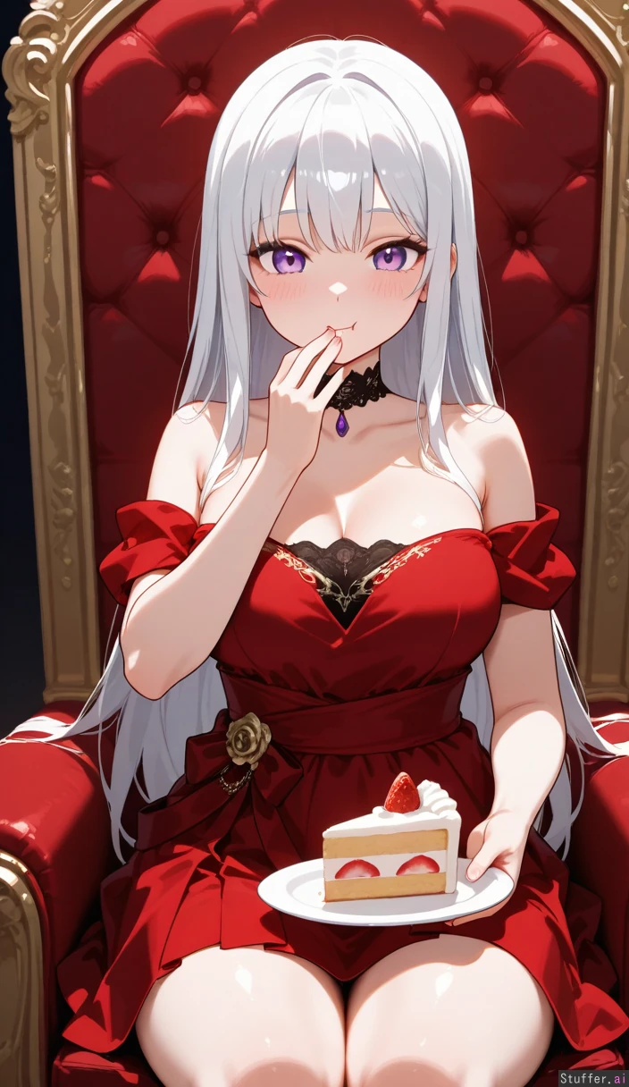 White hair, straight hair, long hair, purple eyes, Red white and black royal dress, choker, Sitting on throne, happy, eating slice of cake, blushing, (((Thighs:0.6))), (((breasts:0.6))), (((hips:0.6))), (((belly:1.0))), (((chubby arms:0.2))) Viewed from front,