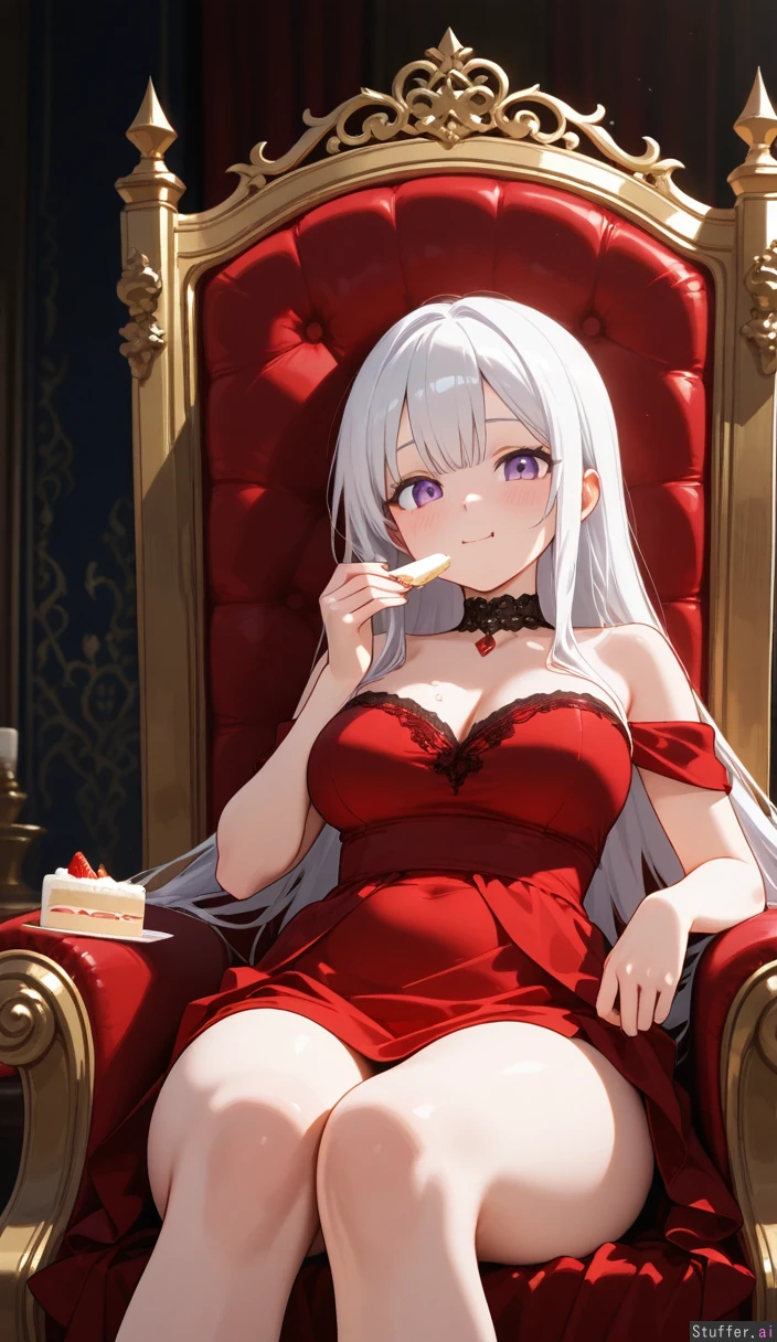 White hair, straight hair, long hair, purple eyes, Red white and black royal dress, choker, Sitting on throne, happy, eating slice of cake, blushing, (((Thighs:1.0))), (((breasts:0.6))), (((hips:0.8))), (((belly:1.0))), (((chubby arms:0.2))) Viewed from front,