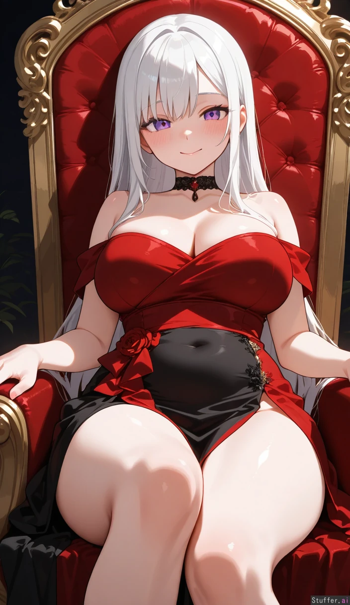 White hair, straight hair, long hair, purple eyes, Red white and black colour palette royal dress, choker, Sitting on throne, happy, blushing, squeezing thigh, (((Thighs:1.0))), (((breasts:1.0))), (((hips:1.0))), (((belly:1.0))), (((chubby arms:0.2))) Viewed from front,
