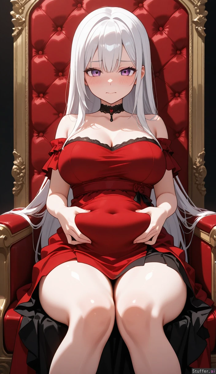 White hair, straight hair, long hair, purple eyes, Red white and black colour palette royal dress, choker, Sitting on throne, embarrassed, blushing, squeezing belly, (((Thighs:1.0))), (((breasts:1.0))), (((hips:1.0))), (((belly:1.0))), (((chubby arms:0.2))) Viewed from front,