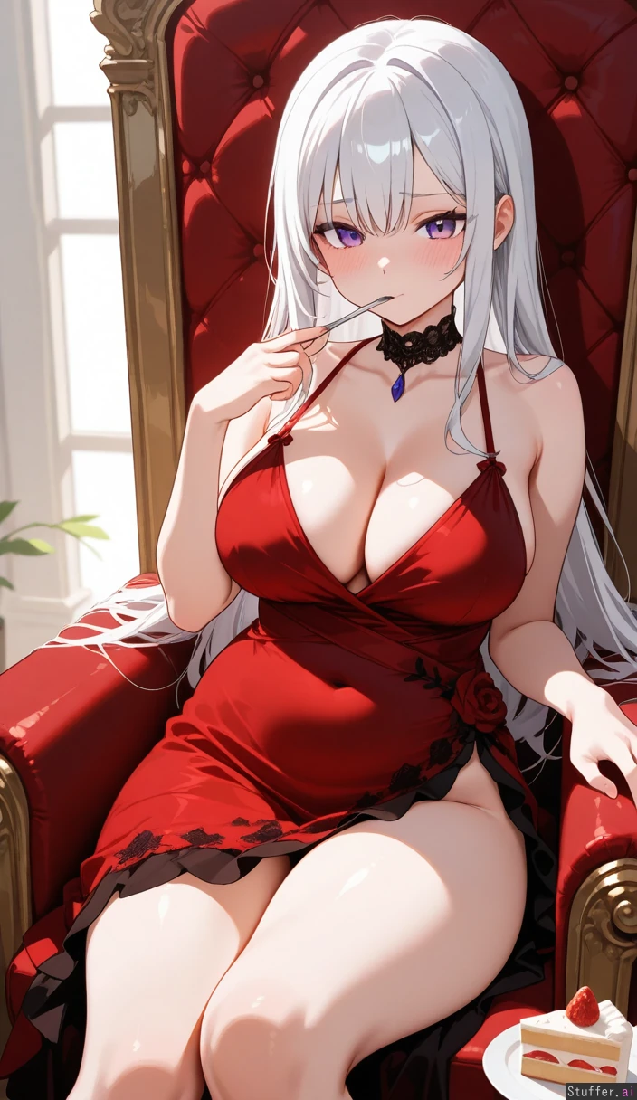 White hair, straight hair, long hair, purple eyes, Red white and black colour palette royal dress, choker, Sitting on throne, embarrassed, blushing, eating slice of cake, (((Thighs:1.2))), (((breasts:1.2))), (((hips:1.2))), (((belly:1.2))), (((chubby arms:0.6))) Viewed from front,