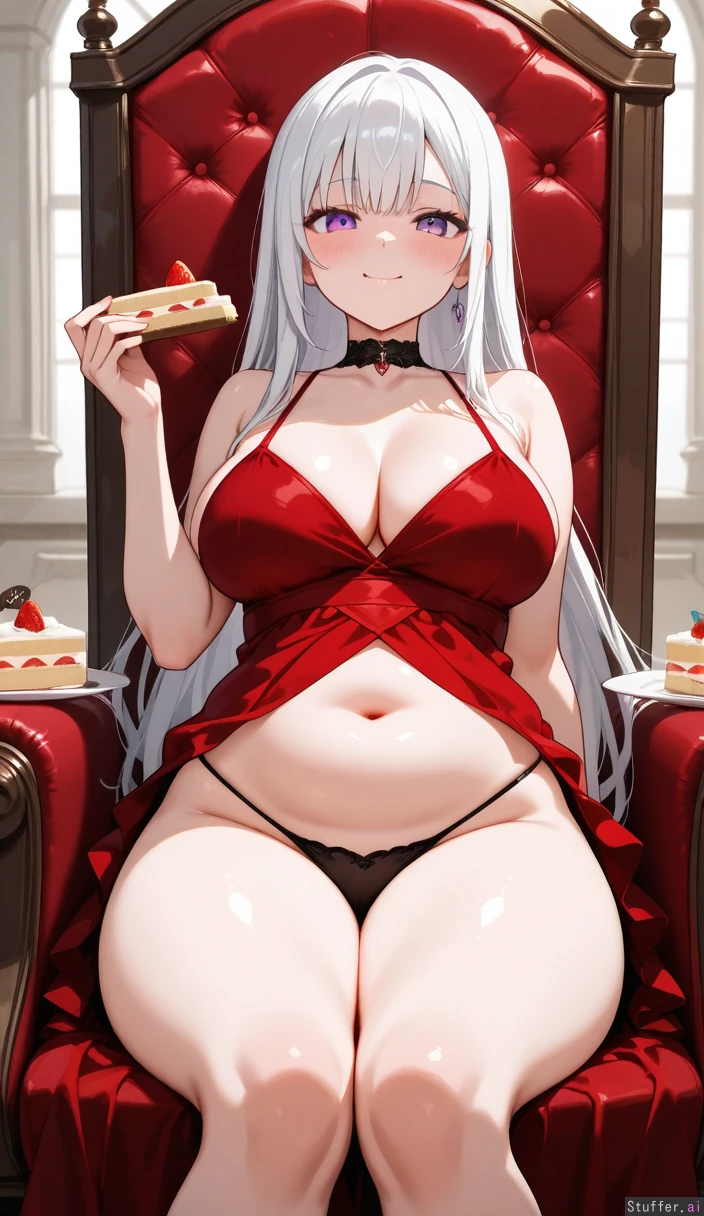 White hair, straight hair, long hair, purple eyes, Red white and black colour palette royal dress, choker, Sitting on throne, smiling, blushing, eating slice of cake, (((Thighs:1.4))), (((breasts:1.4))), (((hips:1.4))), (((belly:1.4))), (((chubby arms:0.7))) Viewed from front,