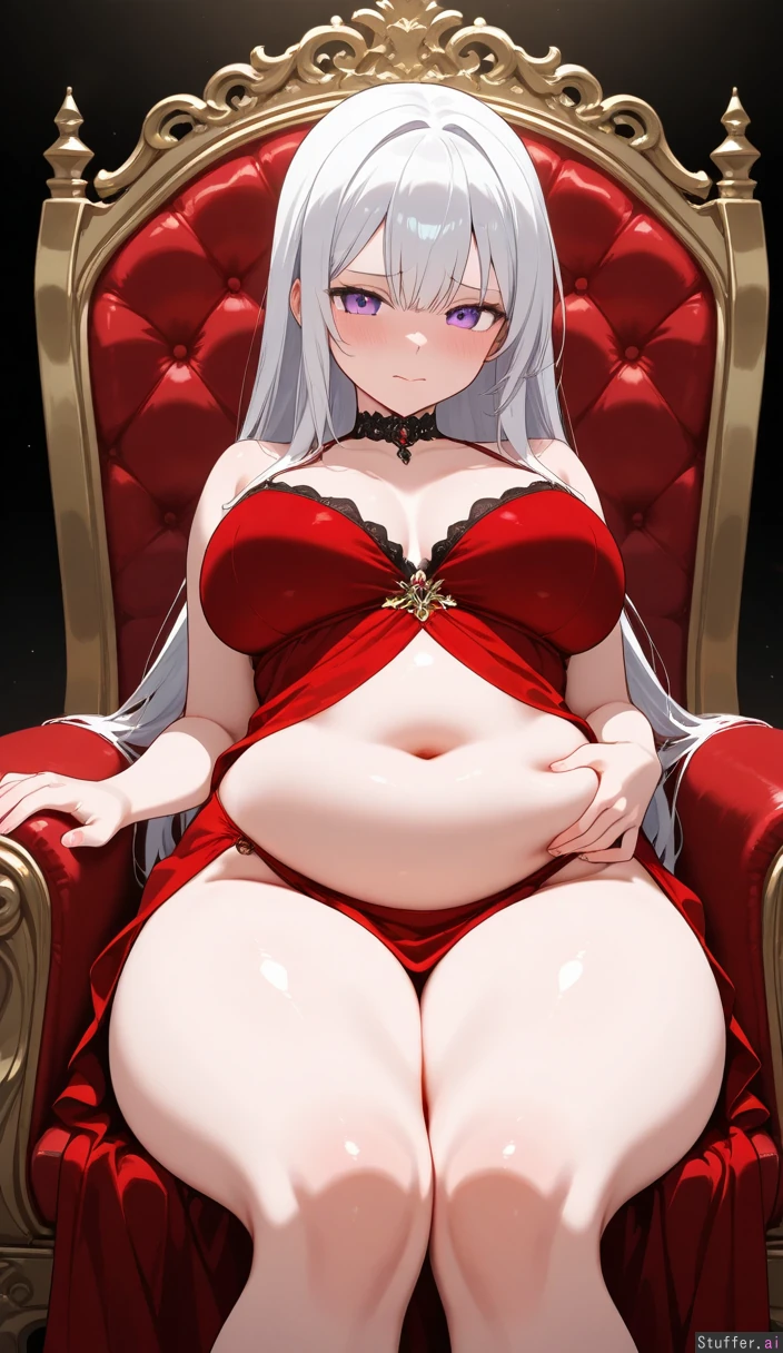 White hair, straight hair, long hair, purple eyes, Red white and black colour palette royal dress, choker, Sitting on throne, embarrassed, blushing, squeezing belly, (((Thighs:1.4))), (((breasts:1.4))), (((hips:1.4))), (((belly:1.6))), (((chubby arms:0.7))) Viewed from front,