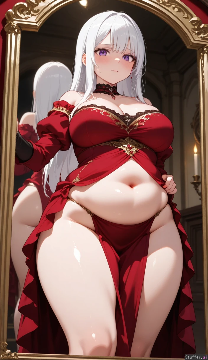 White hair, straight hair, long hair, purple eyes, Large fluffy red royal dress, choker, In castle, Standing, looking in mirror, embarrassed, blushing, (((Thighs:1.4))), (((breasts:1.4))), (((hips:1.4))), (((belly:1.6))), (((chubby arms:0.7))) Viewed from front,