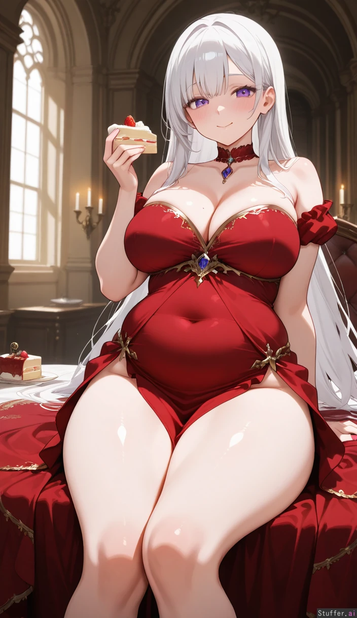 White hair, straight hair, long hair, purple eyes, Large fluffy red royal dress, choker, dress covers belly, In castle, Sitting, in kitchen, eating cake, smiling, blushing, (((Thighs:1.4))), (((breasts:1.4))), (((hips:1.4))), (((belly:1.6))), (((chubby arms:0.7))) Viewed from front,