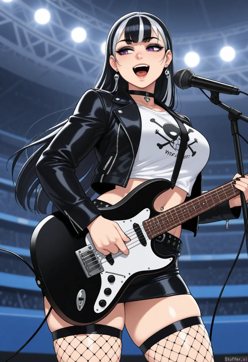 (Krekkov (artist), KAMII MOMORU(artist), KipTeiTei(artist), Lewdlemage(artist)), beautiful shading, highly detailed, best quality, perfect anatomy, perfect proportions, perfect lighting, (best quality), (high rating), absurd res, high res, detailed, ultra quality, ((high quality)), masterpiece, (ultra high resolution), anime style, stunning beauty, detailed face, intricate detail, sophisticated detail, 1girl, exquisite detail, absurd resolution, correct anatomy, 8k, (highly detailed face), highly detailed skin texture, goth_girl, short_black_hair_with_pink_highlights, purple_eyes, silver_earrings, choker, black_leather_jacket, white_skull_t-shirt, midriff, navel_piercing, black_leather_miniskirt, fishnet_stockings, singing, playing_guitar, stadium