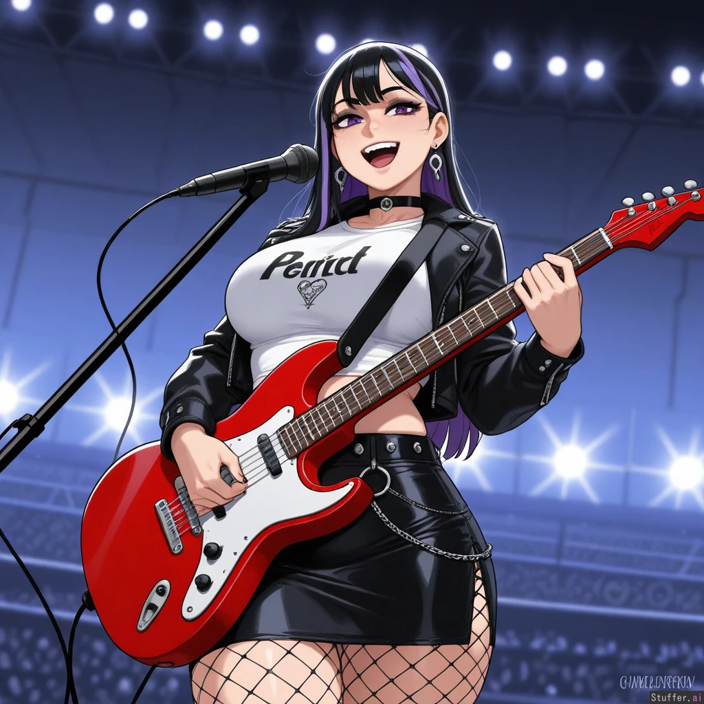(Krekkov (artist), KAMII MOMORU(artist), KipTeiTei(artist), Lewdlemage(artist)), beautiful shading, highly detailed, best quality, perfect anatomy, perfect proportions, perfect lighting, (best quality), (high rating), absurd res, high res, detailed, ultra quality, ((high quality)), masterpiece, (ultra high resolution), anime style, stunning beauty, detailed face, intricate detail, sophisticated detail, 1girl, exquisite detail, absurd resolution, correct anatomy, 8k, (highly detailed face), highly detailed skin texture, goth_girl, short_black_hair_with_pink_highlights, purple_eyes, silver_earrings, choker, black_leather_jacket, white_skull_t-shirt, midriff, navel_piercing, black_leather_miniskirt, fishnet_stockings, singing, playing_guitar, stadium