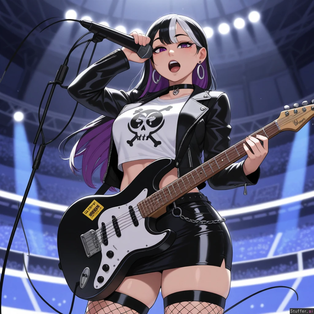 (Krekkov (artist), KAMII MOMORU(artist), KipTeiTei(artist), Lewdlemage(artist)), beautiful shading, highly detailed, best quality, perfect anatomy, perfect proportions, perfect lighting, (best quality), (high rating), absurd res, high res, detailed, ultra quality, ((high quality)), masterpiece, (ultra high resolution), anime style, stunning beauty, detailed face, intricate detail, sophisticated detail, 1girl, exquisite detail, absurd resolution, correct anatomy, 8k, (highly detailed face), highly detailed skin texture, goth_girl, short_black_hair_with_pink_highlights, purple_eyes, silver_earrings, choker, black_leather_jacket, white_skull_t-shirt, midriff, navel_piercing, black_leather_miniskirt, fishnet_stockings, singing, playing_guitar, stadium