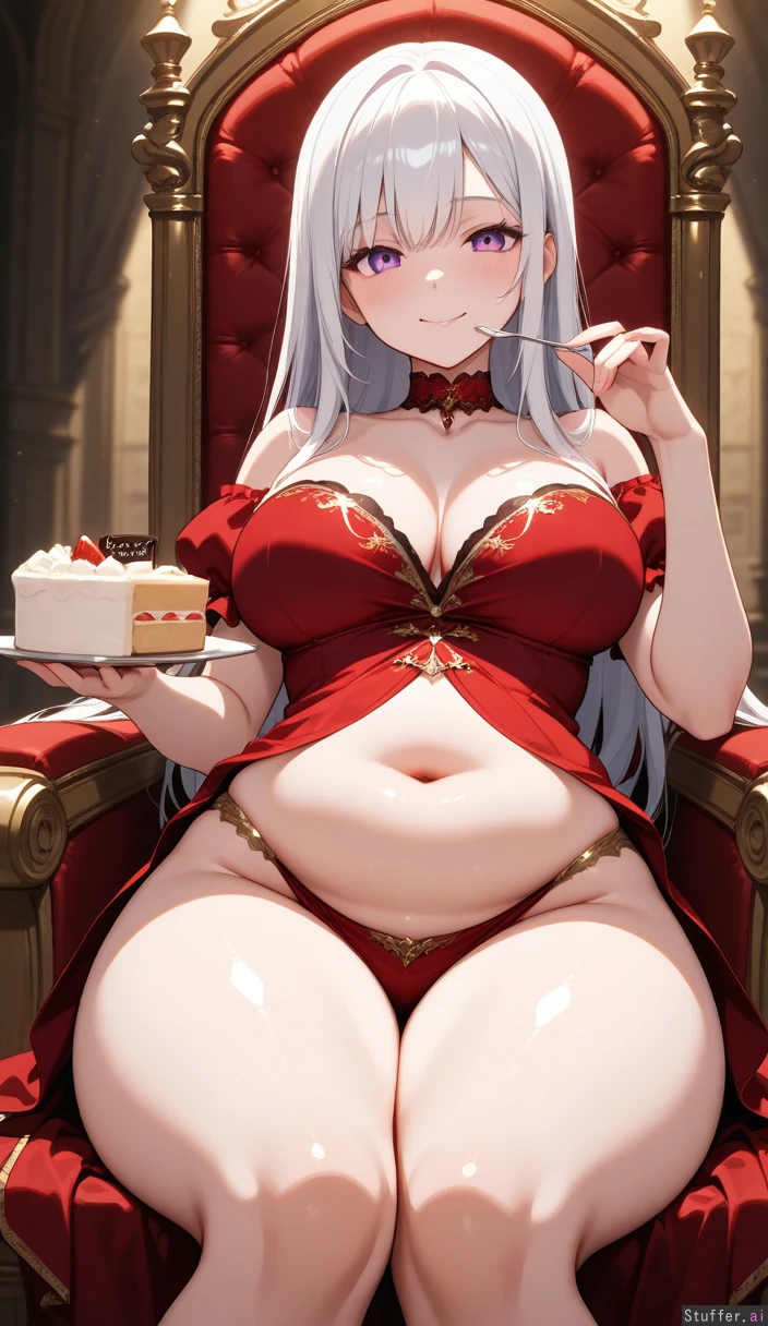 White hair, straight hair, long hair, purple eyes, Large red royal dress, choker, In castle, Sitting on throne, eating cake, smiling, blushing, (((Thighs:1.8))), (((breasts:1.8))), (((hips:1.8))), (((belly:1.8))), (((chubby arms:0.8))) Viewed from front,