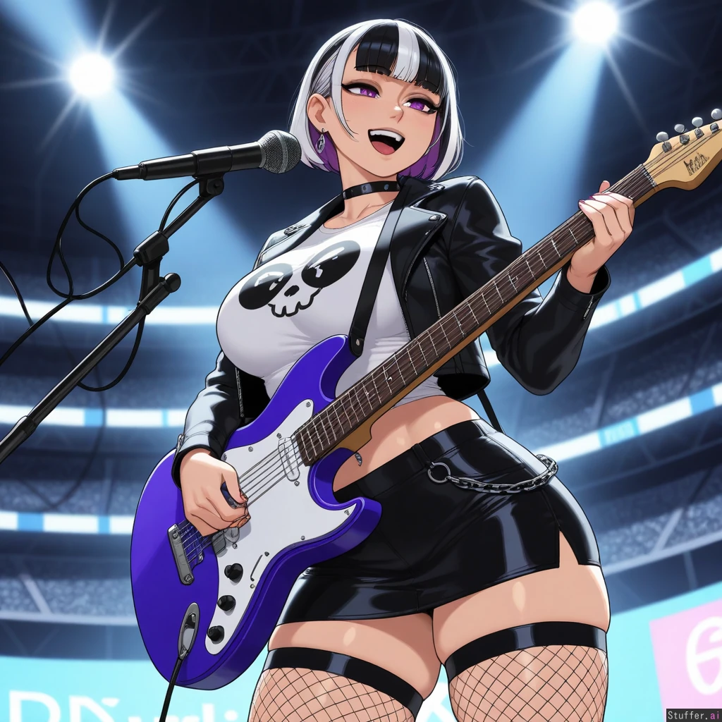 (Krekkov (artist), KAMII MOMORU(artist), KipTeiTei(artist), Lewdlemage(artist)), beautiful shading, highly detailed, best quality, perfect anatomy, perfect proportions, perfect lighting, (best quality), (high rating), absurd res, high res, detailed, ultra quality, ((high quality)), masterpiece, (ultra high resolution), anime style, stunning beauty, detailed face, intricate detail, sophisticated detail, 1girl, exquisite detail, absurd resolution, correct anatomy, 8k, (highly detailed face), highly detailed skin texture, goth_girl, short_black_pixiecut_with_pink_highlights, purple_eyes, silver_earrings, choker, black_leather_jacket, white_skull_t-shirt, midriff, navel_piercing, black_leather_miniskirt, fishnet_stockings, singing, playing_guitar, stadium, (obese:0.8)