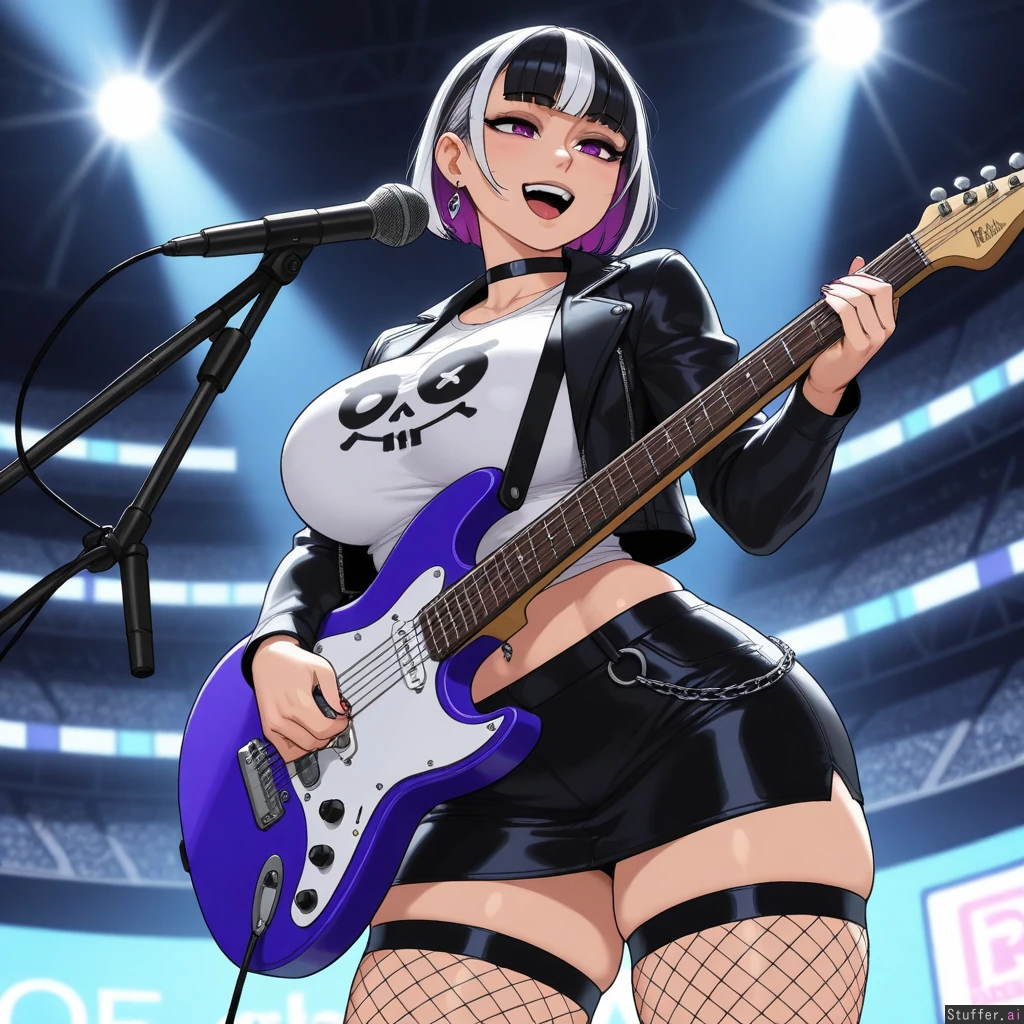 (Krekkov (artist), KAMII MOMORU(artist), KipTeiTei(artist), Lewdlemage(artist)), beautiful shading, highly detailed, best quality, perfect anatomy, perfect proportions, perfect lighting, (best quality), (high rating), absurd res, high res, detailed, ultra quality, ((high quality)), masterpiece, (ultra high resolution), anime style, stunning beauty, detailed face, intricate detail, sophisticated detail, 1girl, exquisite detail, absurd resolution, correct anatomy, 8k, (highly detailed face), highly detailed skin texture, goth_girl, short_black_pixiecut_with_pink_highlights, purple_eyes, silver_earrings, choker, black_leather_jacket, white_skull_t-shirt, midriff, navel_piercing, black_leather_miniskirt, fishnet_stockings, singing, playing_guitar, stadium, (obese:0.875)