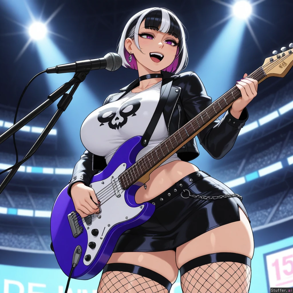 (Krekkov (artist), KAMII MOMORU(artist), KipTeiTei(artist), Lewdlemage(artist)), beautiful shading, highly detailed, best quality, perfect anatomy, perfect proportions, perfect lighting, (best quality), (high rating), absurd res, high res, detailed, ultra quality, ((high quality)), masterpiece, (ultra high resolution), anime style, stunning beauty, detailed face, intricate detail, sophisticated detail, 1girl, exquisite detail, absurd resolution, correct anatomy, 8k, (highly detailed face), highly detailed skin texture, goth_girl, short_black_pixiecut_with_pink_highlights, purple_eyes, silver_earrings, choker, black_leather_jacket, white_skull_t-shirt, midriff, navel_piercing, black_leather_miniskirt, fishnet_stockings, singing, playing_guitar, stadium, (obese:0.9)
