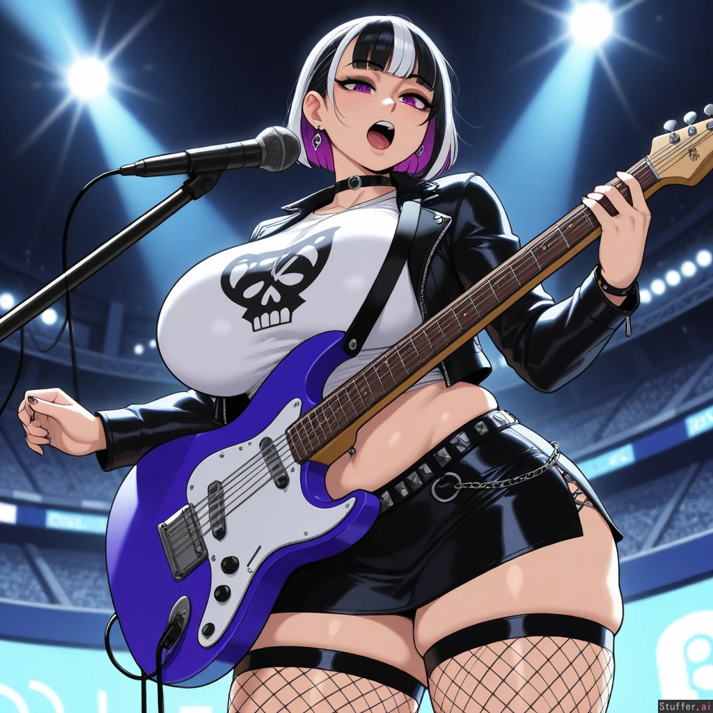 (Krekkov (artist), KAMII MOMORU(artist), KipTeiTei(artist), Lewdlemage(artist)), beautiful shading, highly detailed, best quality, perfect anatomy, perfect proportions, perfect lighting, (best quality), (high rating), absurd res, high res, detailed, ultra quality, ((high quality)), masterpiece, (ultra high resolution), anime style, stunning beauty, detailed face, intricate detail, sophisticated detail, 1girl, exquisite detail, absurd resolution, correct anatomy, 8k, (highly detailed face), highly detailed skin texture, goth_girl, short_black_pixiecut_with_pink_highlights, purple_eyes, silver_earrings, choker, black_leather_jacket, white_skull_t-shirt, midriff, navel_piercing, black_leather_miniskirt, fishnet_stockings, singing, playing_guitar, stadium, (obese:1.0)